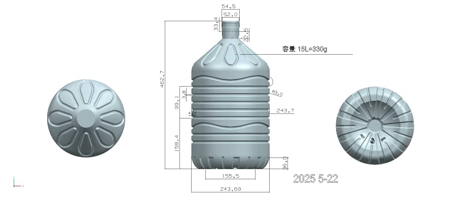 Nepovratni PET balon kapaciteta 15 litara za punionice i distributere vode i za profesionalnu distribuciju. Visina balona je 462.7mm, prečnik 243.69mm, širina grlića 54.5mm, za dubinu čepa od 33.4mm
