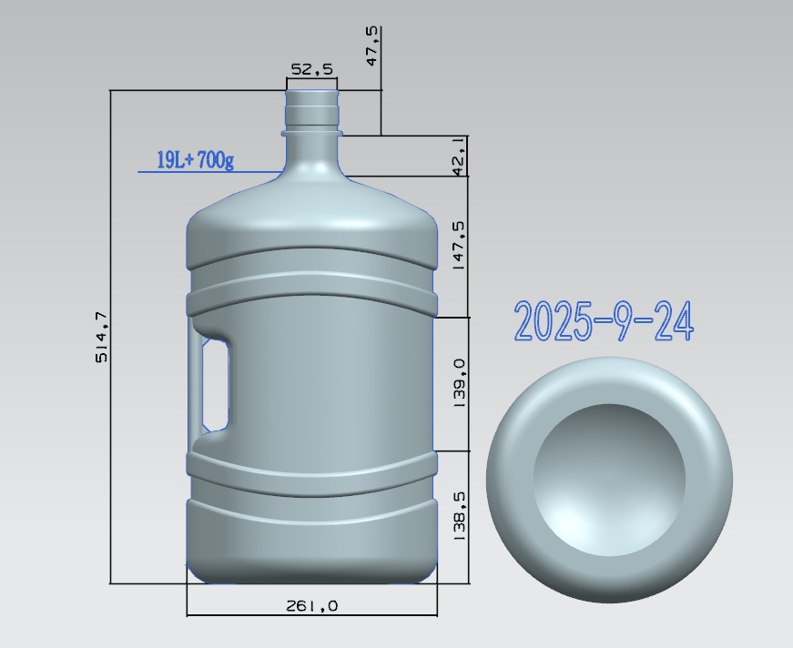 Povratni PET balon kapaciteta 18.9 litara za punionice i distributere vode i za profesionalnu distribuciju. Visina balona je 514.7mm, prečnik 261mm, širina grlića 52.5mm, za dubinu čepa od 47.5mm